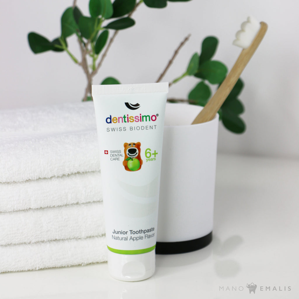 Зубна паста Dentissimo Junior має освіжаючий яблучний смак, тому діти із задоволенням чиститимуть зуби щодня.